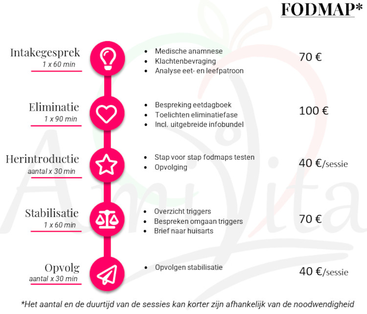 Bij de fodmap-begeleiding ontvang je o.a. een uitgebreide bundel bij de eliminatie- en stabilisatiefase, een dagschema, boodschappenlijstje, productinfo en zo veel meer zodat het dieet goed gevolgd kan worden. Dit is immers belangrijk om bij herintroductie de triggers te kunnen bepalen.